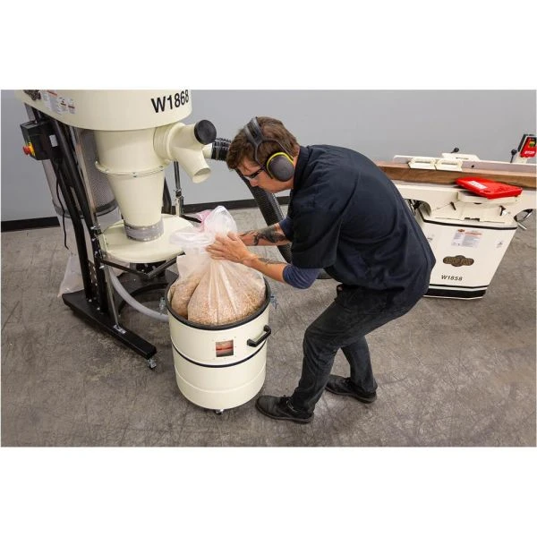 The W1868 Cyclone Dust Collector provides the efficiency of a 2-stage cyclone system with the portability of a single-stage dust collector. Featuring an impressive 1023 CFM and up to 10.9″ of static pressure, creating a vortex of incoming air that extracts heavy wood chips and large dust particles into a plastic-bag-lined 20-gallon steel drum. The remaining fine dust travels past the 13″ aluminum impeller, is caught by a canister filter and then deposited in a separate plastic collection bag. The spun-bond polyester filter catches 99.9% of particles to 1 micron in size and is pleated to provide maximum surface area for efficient air flow. A turn of the filter cleaning handle rotates the paddle brushes, knocking caked-on dust off of the pleats to keep your CFM as high as possible. The collection drum features a quick-release handle that makes it easy to roll it out for sawdust disposal. Features include high surface area pleated filters with paddles to mechanically knock off dust cake, remotely controlled magnetic switches, easy lid lifting levers for emptying collection drums, and a compact design for moving around the shop.